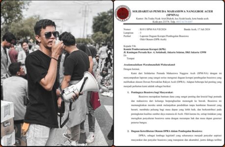 17 Juli 2024 – Solidaritas Pemuda Mahasiswa Nanggroe Aceh (SPM Nanggroe Aceh) resmi melaporkan dugaan korupsi beasiswa 2017 ke KPK. Koordinator SPM Nanggroe Aceh, Rieza Alqusri, menyatakan bahwa langkah ini diambil karena kekecewaan mendalam terhadap lemahnya penegakan hukum di Aceh.