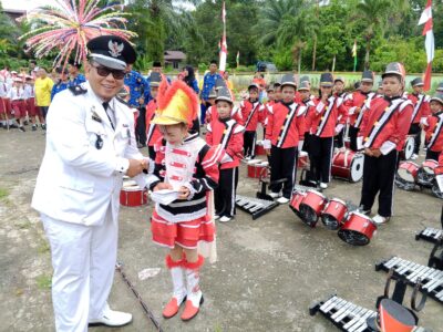 Setelah inspektur upacara Dibubarkan Inspektur upacara Membagikan Sagu Hati Kepada Anak Dramben Dari SD N 7 Rupat desa Hutan Panjang