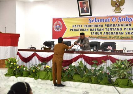 Bupati Humbang Hasundutan yang diwakili Asisten Pemerintahan dan Kesra Jaulim Simanullang menyampaikan Nota Pengantar Keuangan Rancangan Peraturan Daerah (Ranperda) PAPBD Tahun Anggaran (T.A) 2024 pada Rapat Paripurna DPRD di Ruang Rapat Paripurna DPRD Kabupaten Humbang Hasundutan, Selasa 20/8/2024.