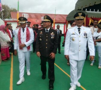 Kepala Lembaga Pemasyarakatan (Kalapas) Kelas IIB Tual, Maulana Lutjfiyanto yang didampingi Penjabat Bupati Maluku Tenggara, Drs. Jasmono M.Si juga Penjabat Walikota Tual Affandy Hassanusi saat pelaksanaan upacara pemberian Remisi.