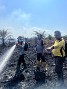 Pada hari Kamis (1/08/2024) dilaksanakan kegiatan pendinginan di lokasi kebakaran hutan dan lahan yang diperkirakan terbakar seluas 2 hektar. Kondisi lahan hutan dan lahan yang terbakar semak belukar, kebun sawit dan kebun karet dengan kondisi tanah Gambut.