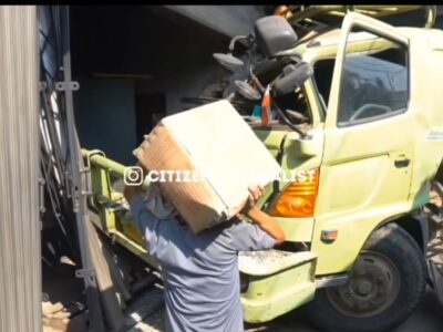 Laka Lantas Terjadi di Jl. Raya Tlajung Udik, Bogor Sebuah Truk Tabrak Toko Pakan Ternak