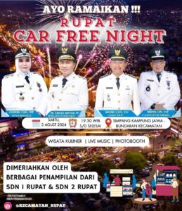 Suatu terobosan baru dalam rangka memberikan Suasana yang berbeda di malam libur di Kecamatan Rupat dengan melaksanakan Car Free Night pada Hari Jumat tanggal 2 Agustus 2024 yang dimulai pukul 19.30 malam nanti.