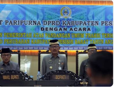 Bupati Pesisir Barat (Pesibar), Dr. Drs. Agus Istiqlal, S.H., M.H., menghadiri rapat Paripurna Dewan Perwakilan Rakyat Daerah (DPRD) dengan agenda Jawaban Pemerintah Atas Pandangan Umum Fraksi-Fraksi DPRD Terhadap Rancangan Peraturan Daerah (Ranperda) tentang Anggaran Pendapatan dan Belanja Daerah (APBD) Perubahan Tahun 2024, di ruang paripurna DPRD Pesibar, Jumat (2/8/2024).