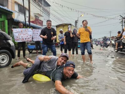 28 Agustus 2024. Beberepa pemuda yang mengatas namakan Pemuda Penggiat Sosial bersama puluhan masyarakat melakukan aksi berenang dan memancing di Jln Yos Sudarso (Simpang Menara Lima) yang dalam keadaan rusak parah (27/8/24).