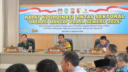 Rakor lintas sektoral Operasi Mantap Praja Semeru 2024 dilaksanakan di Ruang Rapat Utama (Rupatama) dihadiri oleh Forkopimda Kabupaten Nganjuk , KPU Nganjuk, Bawaslu Nganjuk, Satpol PP Nganjuk , Dishub Nganjuk dan BPBD Nganjuk.