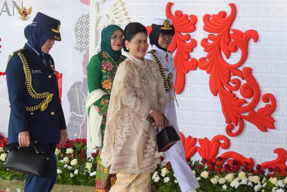 Sementara itu, Ibu Negara Iriana tampil anggun dengan mengenakan kebaya berwarna ‘cream’. Ibu Iriana turut menyempurnakan penampilannya dengan kain dan selendang berwarna senada.