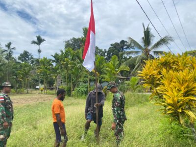 Satgas Pamtas RI-PNG Yonif 122/TS Pos Yetti bersama siswa siswi SD YPK Mahanaim Yetti bersihkan lingkungan sekolah dan bagikan bendera merah putih untuk masyarakat kampung binaan, Kampung Yetti, Distrik Arso Timur, Kabupaten Keerom, Papua, Rabu (21/08/2024).