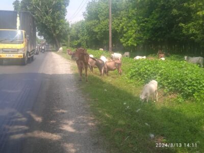 Nah hal inilah yang menjadi halangan bagi para pengguna jalan, karena ternak lembu tersebut sesukanya menyeberang jalan dengan jumlah puluhan ekor setiap harinya. timpalnya