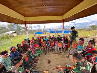 Pos Eromaga Satgas Mobile Yonif 323 Buaya Putih Pimpinan Lettu Inf Anggun melaksanakan ibadah Mingguan bersama masyarakat kampung Eronggobak bertempat di pos Eromaga, Distrik Omukia, Kabupaten Puncak, Papua Tengah, Minggu kemarin (11/08/24).