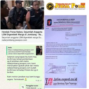 Kami dari media online jatim.expost.co.id sedang konfirmasi terhadap radarjombang.jawapos.com melalui telepon WhatsApp tidak ada respon sama sekali, sangat menyayangkan adanya pemberitaan yang tidak di dasarin konfirmasi ke pihak Polsek Ploso jombang dan yang di beritakan. sudah sangat menyimpang dari kode etik jurnalistik. saya minta pihak radarjombang.jawapos.com untuk meminta maaf terbuka dan memberikan hak jawab kepada yang di beritakan radarjombang.jawapos.com.