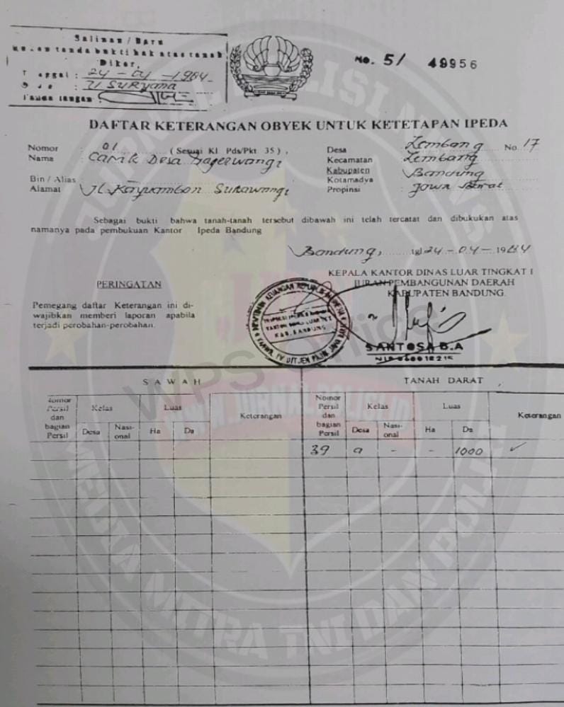 Anehnya, tanah negara bekas Hak Erfpacht yang kini telah berdiri Kantor Kecamatan Lembang, Yayasan Pendidikan Pancakarsa Lembang dan sejumlah rumah warga yang berada di komplek perumahan Sukawangi itu muncul selembar berkas fotocopy Daftar Keterangan Obyek Untuk Ketetapan Iuran Pembangunan Daerah (Ipeda) Kabupaten Bandung tertanggal 24 April 1984 yang ditandatangani oleh Kepala Kantor Dinas Luar Tingkat 1, Santosa, B.A.