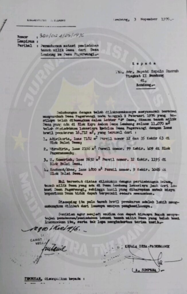 Bahkan yang lebih parahnya lagi, ditemukan kembali oleh Tim Investigasi Jurnal Polisi News, fotocopy Surat permohonan mutasi pemindahan tanah milik Desa dari Desa Lembang ke Desa Pagerwangi yang ditandatangani langsung oleh Kepala Desa Pagerwangi Atang Sumpena kepada Bupati Kepala Daerah Tingkat ll Bandung tertanggal 3 November 1976.