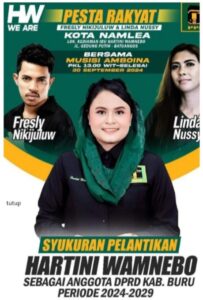 Hartini Wamnebo, Bakal Menggelar Pesta Rakyat Dan Memberikan Santunan Kepada Anak Yatim Saat Syukuran Pelantikan Dirinya Sebagai Anggota DPRD Buru Yang Direncanakan Tanggal 30 September 2024.
