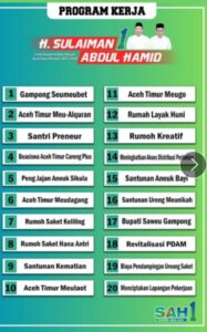 Haji’ Sulaiman Dan Abdul Hamid paslon No 1 memiliki visi-misi dan program 20 Visi yang Akan di Laksanakan untuk 5 Tahun Kedepannya Ini lah Visi dan Misi Calon Bupati Aceh Timur Haji’ Sulaiman Dan Abdul Hamid (SAH).