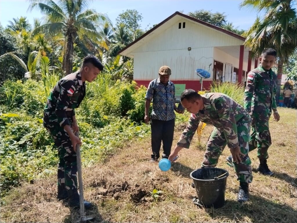 Satuan tugas pengamanan perbatasan Batalyon Infanteri 122/TS bagikan bibit pohon dan melaksanakan penanaman bibit pohon bersama di Kampung Mosso, Distrik Muaratami, Kota Jayapura, Sabtu (14/09/2024).
