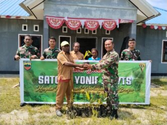 Satuan tugas pengamanan perbatasan Batalyon Infanteri 122/TS bagikan bibit pohon dan melaksanakan penanaman bibit pohon bersama di Kampung Mosso, Distrik Muaratami, Kota Jayapura, Sabtu (14/09/2024).