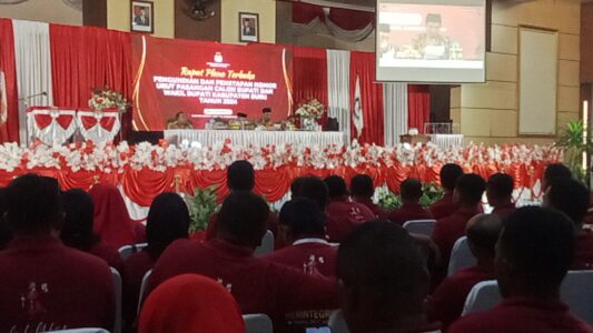 Komisi Pemilihan Umum (KPU) Buru Menggelar Sidang Pleno Terbuka Pengundian Dan Penetapan Nomor Urut Pasangan Calon Bupati Dan Wakil Bupati Tahun 2024, Di Aula Kantor Bupati Buru, Senin, (23/09/2034).