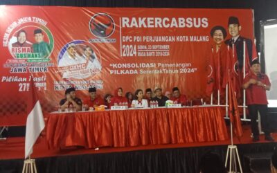 Malang- jurnalpolisi.id Dewan Pimpinan Cabang (DPC) PDI Perjuangan Kota Malang menggelar Rapat Kerja Cabang Khusus (Rakercabsus) dalam rangka pemenangan Pilkada serentak tahun 2024 di Kantor DPC PDI Perjuangan, Jl. Panji Suroso 5c, Blimbing, Kota Malang, Senin (23/09/2024). Hadir dalam Rakecabsus ini antara lain Pengurus DPD PDI Perjuangan Jatim Dewanti Rumpoko, Ketua DPC PDI Perjuangan Kota…
