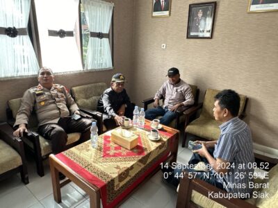 Didampingi Kanit KK AKP Suwondo, Kapolsek mengundang Wali Negeri Kekerabatan Kesultanan Siak Sri Indrapura Kecamatan Minas Datuk Alam Ilahi keruang kerjanya untuk melakukan silaturahmi dan sosialisasi Pilkada damai.