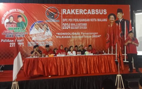 Dewan Pimpinan Cabang (DPC) PDI Perjuangan Kota Malang menggelar Rapat Kerja Cabang Khusus (Rakercabsus) dalam rangka pemenangan Pilkada serentak tahun 2024 di Kantor DPC PDI Perjuangan, Jl. Panji Suroso 5c, Blimbing, Kota Malang, Senin (23/09/2024).