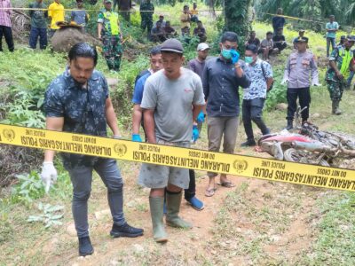 Polisi melakukan olah tempat kejadian perkara (TKP) atas penemuan seorang pria yang meninggal dunia di area perkebunan PT Satya Agung, Geuredong Pase, Aceh Utara, pada Kamis (26/9/2024) sekitar pukul 11.00 WIB.
