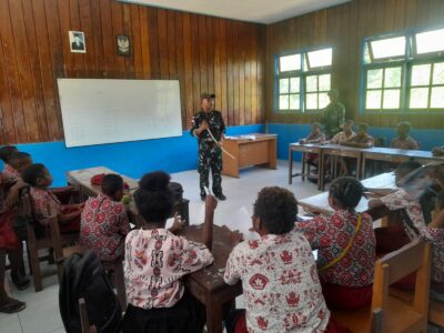 Pos Yamor Satgas Pamtas RI-PNG Kewilayan Papua Barat Yonif 642 menyalurkan ilmu pengetahuan dan wawasan kepada murid SDN Ururu Distrik Yamor, Kabupaten Kaimana, Provinsi Papua Barat, 26 September 2024.