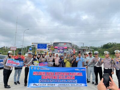 Personel Ditlantas Polda Riau melaksanakan kegiatan Kampanye Keselamatan dan Cooling System Pilkada Damai 2024 yang dipimpin langsung Kasi BPKB Subdit Regident Ditlantas Polda Riau Kompol Rosna Meilani, S.I.K., M.Si di gerbang Tol Pekanbaru Bangkinang hingga Gerbang Tol Sungai Pinang yang diikuti Pihak Menajemen PT HK dan PT Jasa Raharja Riau.