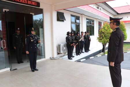 Upacara Berlangsung Di Lapangan Apel Polres Buru Dengan Dihadiri Oleh . 1 Platon Kompi 3 Bataliyon A Pelopor Brimob Polda Maluku, 1 Palton Sat Samapta Polres Buru,1 Palton Sat Lantas Polres Buru,1 Playon Gabungan Staf Polres Buru,1 Palton Gabungan Sat Reskrim,Say NarKoba Dan Say Intelkam Dalam Suasana Khidmat, Berbagai Rangkaian Acara Dilaksanakan, Seperti Pembacaan Teks Pancasila.Dan Undang -Undang Dasar 1945 Semua Peserta Tampak Serius Mengikuti Jalannya Upacara, Menggambarkan Rasa Hormat Kepada Nilai-Nilai Pancasila.