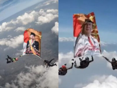 Foto kedua pemimpin itu kemudian berkibar di langit sambil dibawa oleh para penerjun payung. Selain itu, para penerjun payung juga membawa bendera satuan Polri.