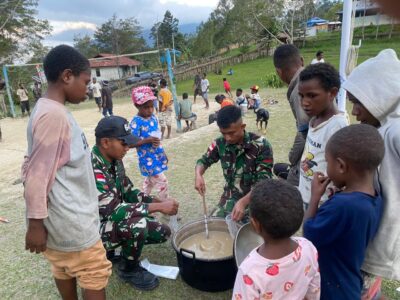 Perhatikan Gizi Anak Papua Satgas 641/Bru Bagikan Bubur Kacang Hijau kepada Anak-Anak Distrik Eragayam
