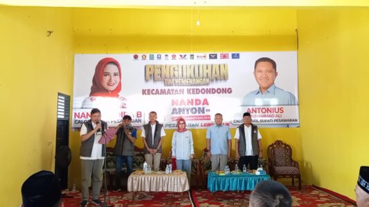 Tim Pemenangan Koalisi Untuk Rakyat (KUR) Pasangan Calon (Paslon) Bupati dan Wakil Bupati Kabupaten Pesawaran nomor urut 2, Nanda Indira -Antonius Muhammad Ali mengukuhkan tim pemenangan Kecamatan Kedondong dan Waykhilau, Kamis 17 Oktober 2024.