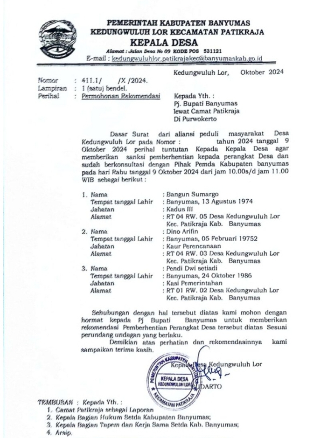 (09/10/2024) Warga Desa Kedungwuluh Lor, Kecamatan Patikraja, Kabupaten Banyumas turun aksi di depan kantor Bupati Banyumas meminta pertanggungjawaban tiga oknum perangkat desa yang diduga menggelapkan uang Pajak Bumi dan Bangunan (PBB) yang mereka bayarkan. Karena ulah oknum perangkat desa tersebut mengakibatkan ada beberapa warga yang menunggak PBB.