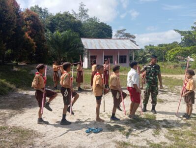 Bentuk Karakter Disiplin, Satgas Pamtas Yonzipur 5/ABW Ajarkan Anka-Anak Perbatasan Latihan Baris-Berbaris