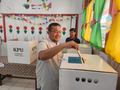 Calon Wali Kota Lhokseumawe H. Fathani memberikan hak suaranya di Tempat Pemungutan Suara (TPS) 04, Desa Kutablang, Kecamatan Banda Sakti, pada Rabu (27/11/2024).