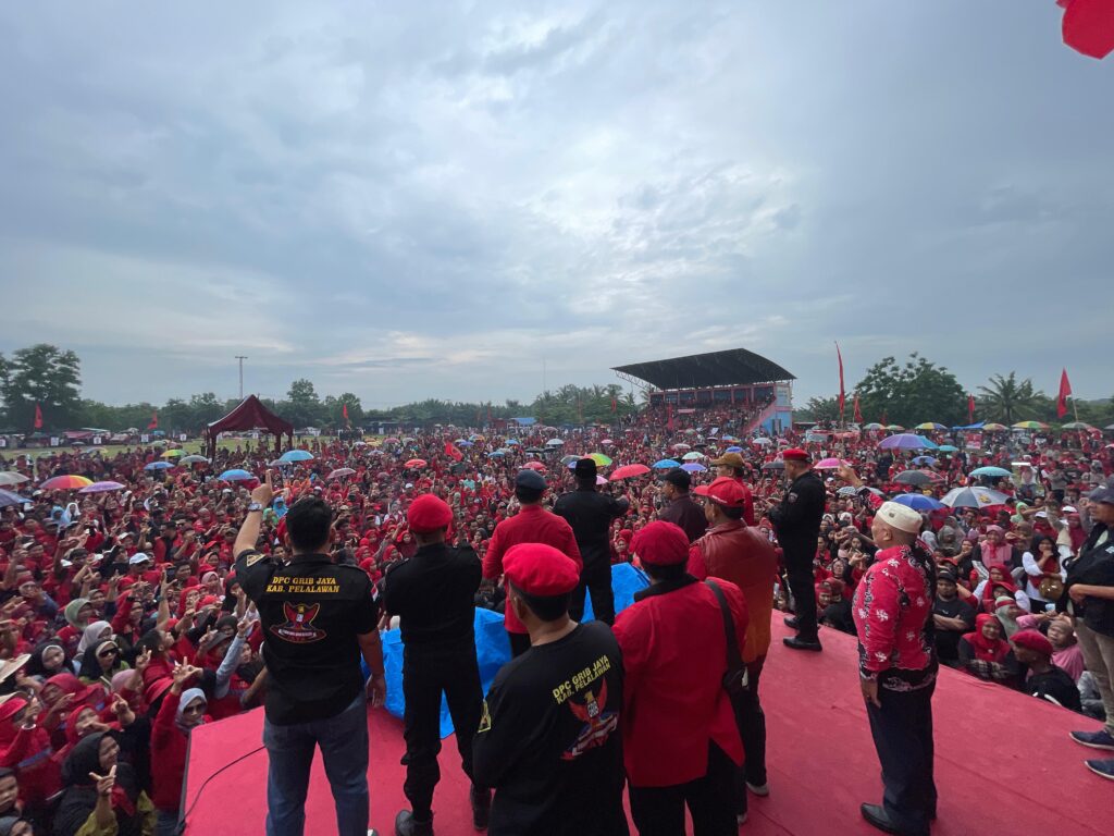 Masyarakat diperkirakan mencapai belasan ribu ini sebagian besar adalah memakai atribut Partai PDI Perjuangan tetap setia mengikuti acara hingga selesai meski diguyur hujan deras.