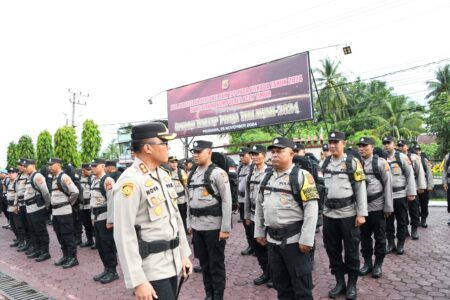 Peserta apel terdiri dari Satuan Tugas Operasi Mantap Praja Seulawah 2024 Polres Aceh Timur dan anggota pengamanan TPS serta personel Brimob Kompi 4 Yon B Pelopor Sampoiniet.