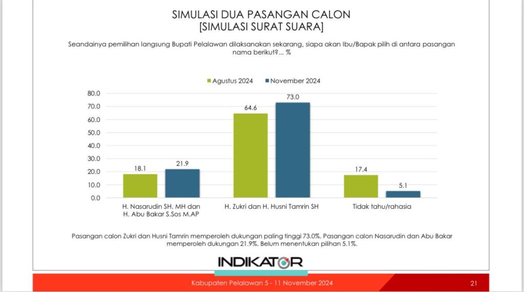 Lembaga survei Indikator mengeluarkan survei elektabilitas jelang Pilkada Pelalawan 2024 dengan hasil paslon Zukri Tamrin menggungguli Pasangan Nazaruddin Abu Bakar, dengan selisih yang sangat signifikan antara lain, Zukri Tamrin 73%, Nazaruddin Abu Bakar 21,9%.