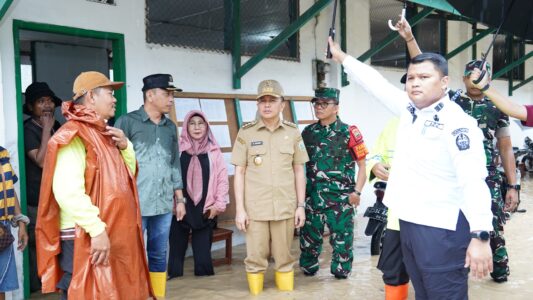 Di lokasi, rombongan melihat kondisi TPS yang terendam banjir, Sejumlah rumah warga juga ikut terendam banjir dengan ketinggian air bervariasi.