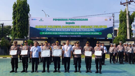 Sebagai wujud berikan apresiasi dan penghargaan atas upaya dan komitmen jaga kelestarian dan keamanan hutan dalam hal kegiatan Perlindungan Hutan (Linhut) Perhutani Divisi Regional Jawa Timur dan Kesatuan Pemangkuan Hutan (KPH) Banyuwangi Selatan memberikan penghargaan kepada jajaran Kepolisan Resor Kota Banyuwangi (Polresta) Banyuwangi sebagai pelopor pemberantasan Illegal Logging di wilayah kerja Perum Perhutani KPH Banyuwangi Selatan di Mapolresta Banyuwangi pada Senin (11/11/2024).
