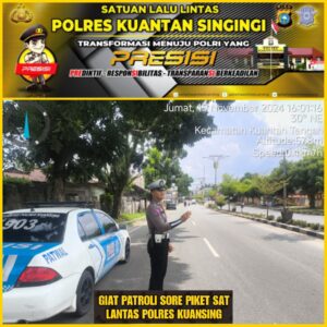 Dalam upaya menjaga keamanan, keselamatan, ketertiban, dan kelancaran lalu lintas (Kamseltibcarlantas) di wilayah hukum Polres Kuantan Singingi (Kuansing) menjelang tahapan Pilkada Serentak 2024, Satuan Lalu Lintas (Sat Lantas) Polres Kuansing melaksanakan patroli sore pada Jumat (15/11/2024). Kegiatan ini dimulai pukul 16.00 WIB hingga selesai, dengan menyasar sejumlah titik strategis di Kota Teluk Kuantan.