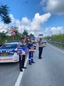 Guna meningkatkan kesadaran pengendara dalam berlalu lintas, antisipasi pelanggaran dan menekan angka fatalitas di Jl. Tol Personel SAT PJR Ditlantas Polda Riau ajak pengendara pengguna JL. TOL untuk mematuhi tata tertib dalam berlalu lintas dengan melaksanakan kegiatan Kampanye Keselamatan dengan mensosialisasikan tata tertib dalam berlalu lintas, Senin (04/11/2024)