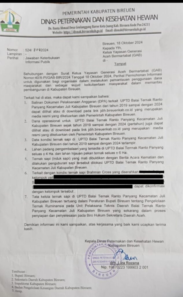 Pada tanggal 10 Oktober 2024 Ketua GAB Aceh melayangkan surat perihal permintaan data Dokumen Pelaksanaan Anggaran (DPA) Nomor : 40/X-PI/ GAB-BIR/2024 kepada Dinas Peternakan dan Kesehatan Hewan Kabupaten Bireuen sebagai bentuk kontrol sosial serta untuk mengawasi, menghindari dan memastikan tidak adanya penyelewengan uang Negara di Dinas yang bersangkutan, dan pada Tanggal 18 Oktober 2024 Kadis Peternakan dan Kesehatan Hewan Bireuen membalas surat Ketua GAB Aceh bahwa data DPA sudah dikirim ke Informasi Keterbukaan Publik (IKP) Dinas Infocom selaku PEJABAT PENGELOLA INFORMASI PUBLIK (PPID) kab. Bireun, via link jdih.bireuenkab.co.id seperti tersebut dalam surat balasan dibawah ini