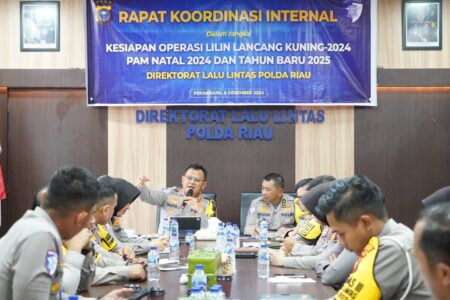 Dalam rangka kesiapan Operasi Lilin Lancang Kuning 2024 dan Pengamanan Natal dan Tahun Baru 2025, Direktur Lalu Lintas ( DIRLANTAS) Polda Riau Kombes Pol Taufiq Lukman Nurhidayat, S.I.K., M.H pimpin langsung kegiatan Rapat Koordinasi Internal Ditlantas Polda Riau yang berlangsung di Aula Rapat Mako Ditlantas Polda Riau.