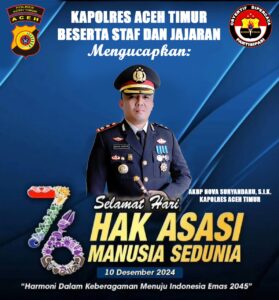 Pada peringatan Hari HAM Sedunia yang diperingati setiap tanggal 10 Desember, Kapolres Aceh Timur AKBP Nova Suryandaru , S.I.K., beserta staf dan jajarannya mengucapkan selamat Hari Hak Asasi Manusia Sedunia ke-76 Tahun 2024.