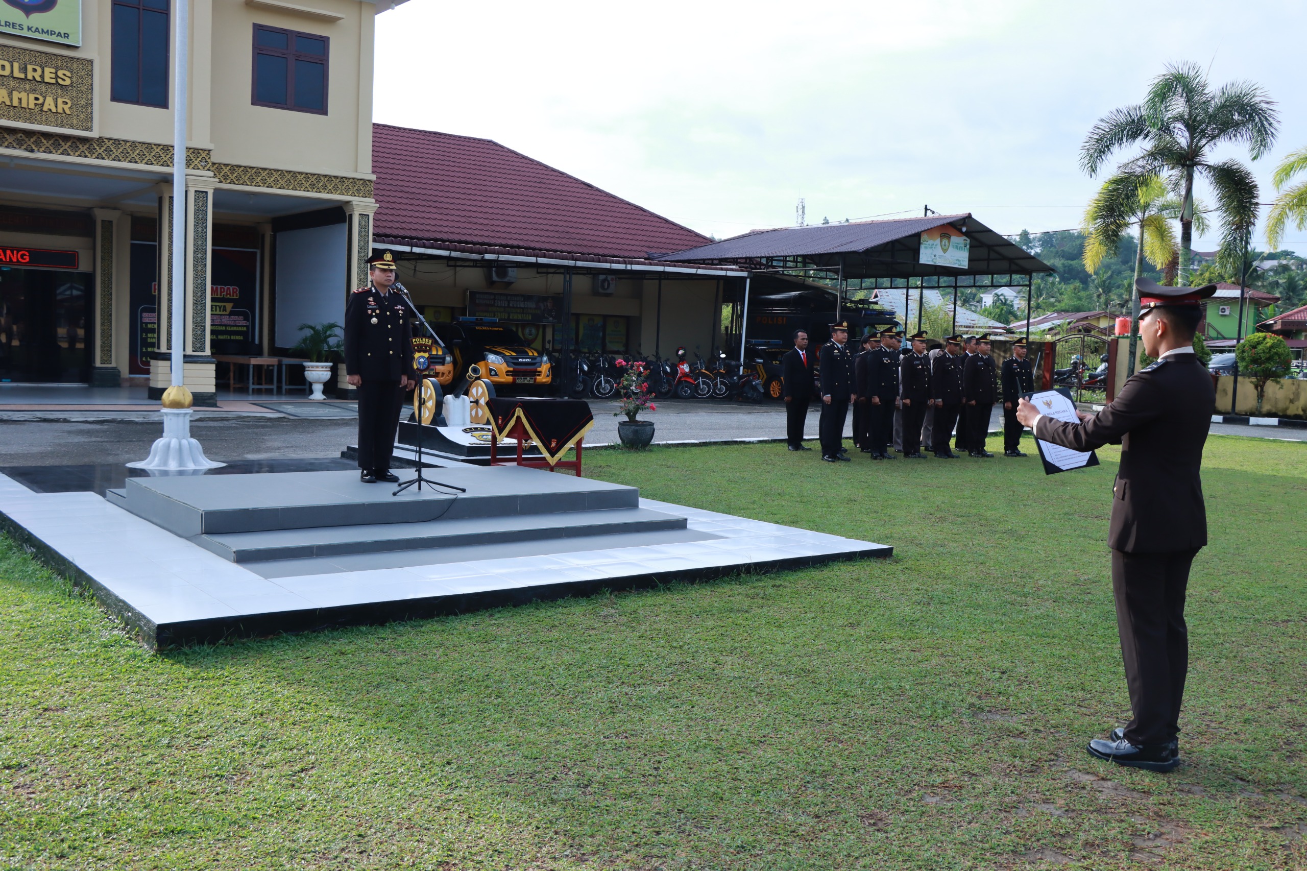 Bertindak selaku Inspektur Upacara Kapolres Kampar AKBP Ronald Sumaja yang di wakili Waka Polres Kampar Kompol Andi Cakra Putra, Perwira upacara Kasi Propam AKP Togar P Silalahi dan Komandan upacara IPDA Irwan Faddilah.