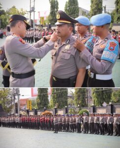 Kapolresta Banyuwangi Polda Jawa Timur Kombespol Rama Samtama Putra memimpin upacara kenaikan pangkat pengabdian anggota di halaman Mapolresta Banyuwangi, pada Senin pagi, (02/12/2024).