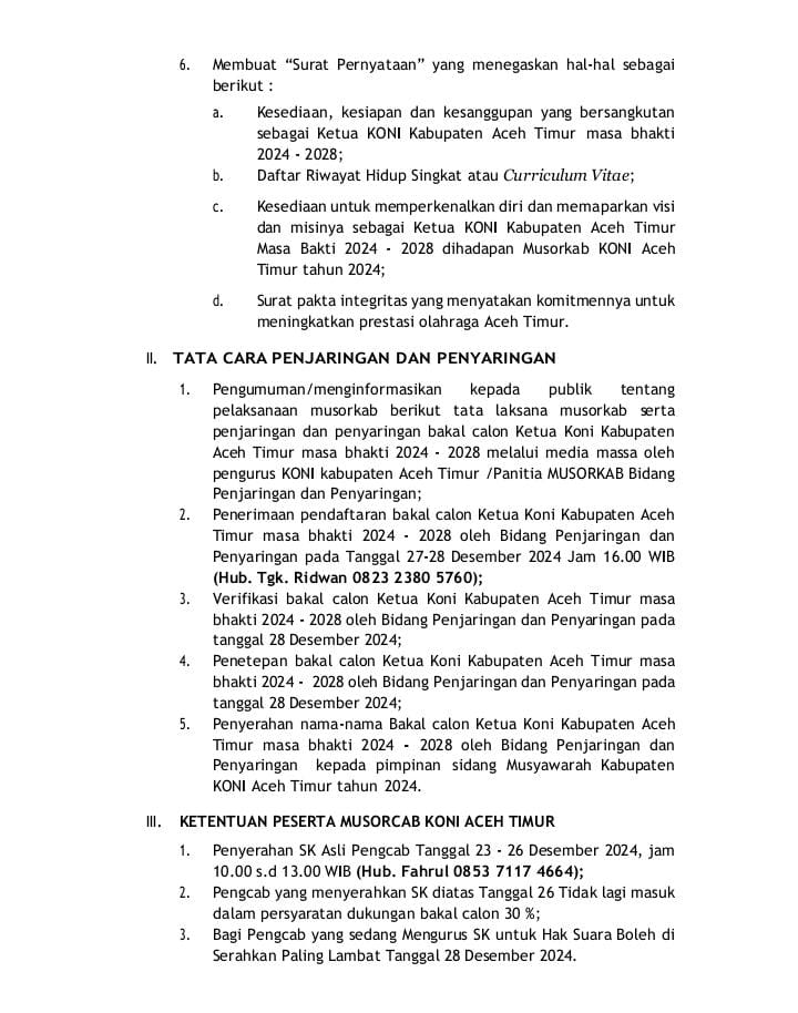 Syahril menambahkan pihaknya juga telah mengirimkan undangan serta juga ikut terlampir susunan dan tatacara penjaringan , penyaringan dan pemilihan bakal calon ketua KONI periode 2024- 2028 kepada seluruh ketua umum pengcab.