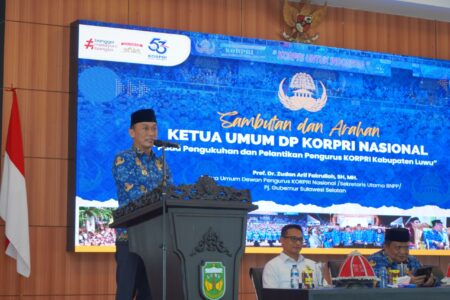 Ketua Umum Korps Pegawai Republik Indonesia (KORPRI) yang juga merupakan Penjabat Gubernur Provinsi Sulawesi Selatan, Prof. Dr. Zudan Arif Fakrulloh, SH, MH menghadiri Pelantikan Pergantian Antar Waktu Dewan Pengurus KORPRI Kabupaten Luwu masa bakti 2022-2027 yang diselenggarakan di Aula Andi Kambo, komplek perkantoran Bupati Luwu, Jum’at (13/12/2024).