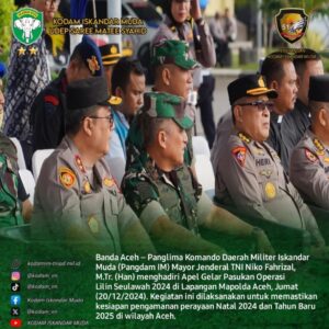 Panglima Komando Daerah Militer Iskandar Muda (Pangdam IM) Mayor Jenderal TNI Niko Fahrizal, M.Tr. (Han) menghadiri Apel Gelar Pasukan Operasi Lilin Seulawah 2024 di Lapangan Mapolda Aceh, Jumat (20/12/2024). Kegiatan ini dilaksanakan untuk memastikan kesiapan pengamanan perayaan Natal 2024 dan Tahun Baru 2025 di wilayah Aceh.
